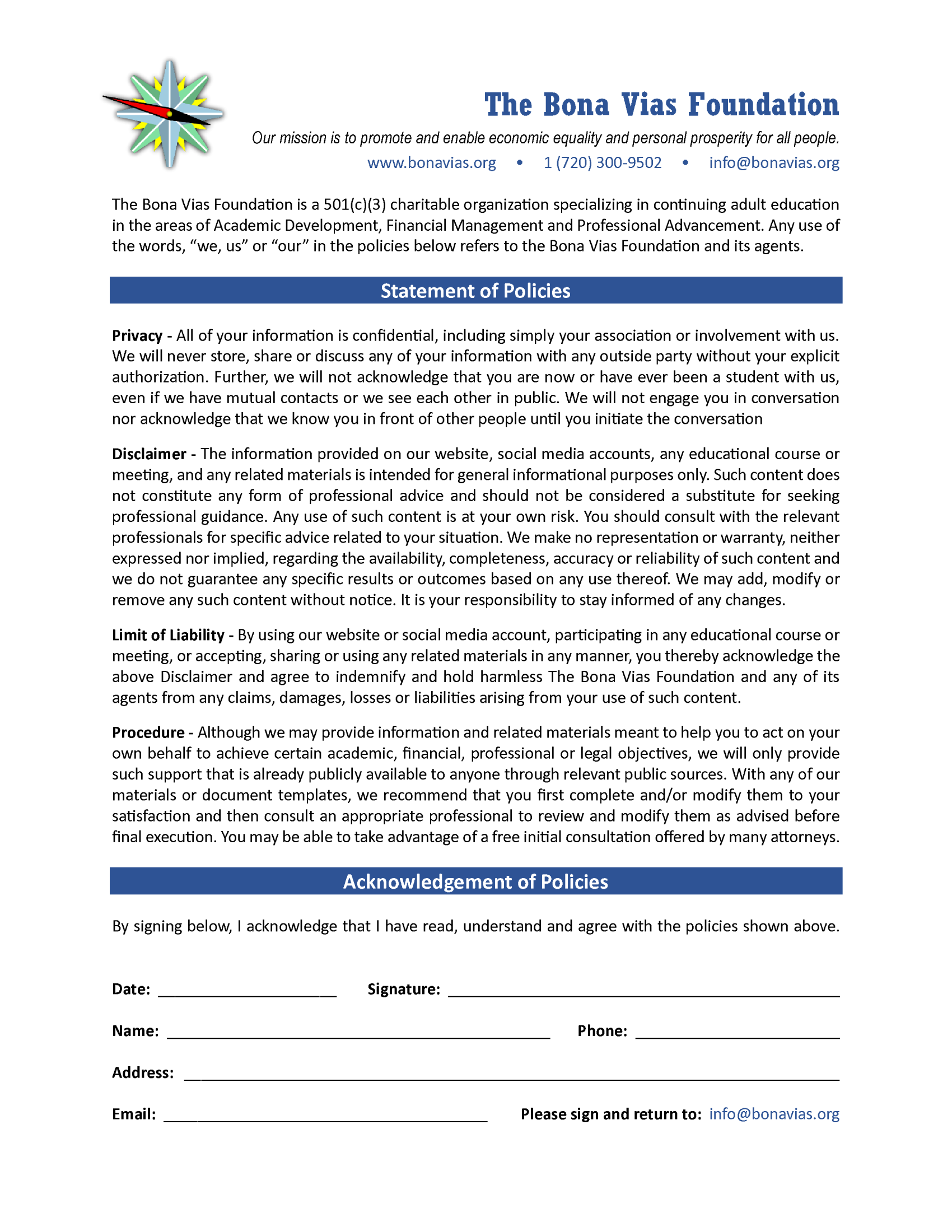 The Bona Vias Foundation is a 501(c)(3) charitable organization specializing in continuing adult education.